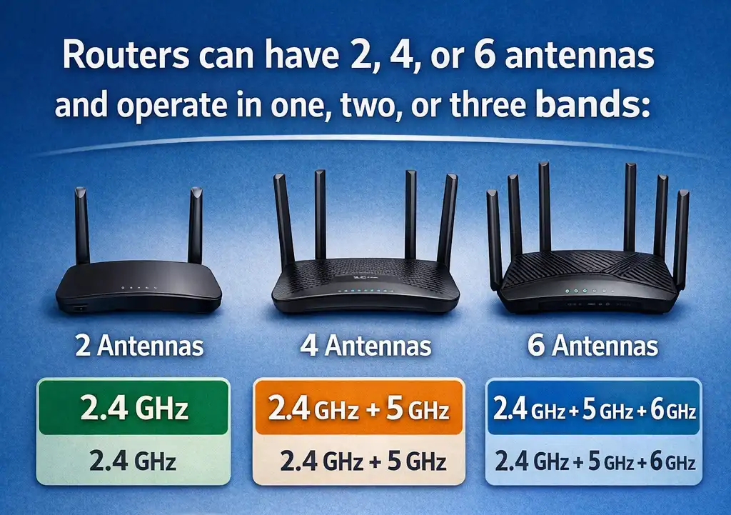 Tegenwoordig kunnen routers twee, vier of zes antennes hebben en werken in één band (2,4 GHz), twee banden (2,4 GHz en 5 GHz) of drie banden (2,4 GHz, 5 GHz en 6 GHz). Daarom is het beter om te focussen op gedetailleerde technische specificaties dan op opvallende marketingtermen.